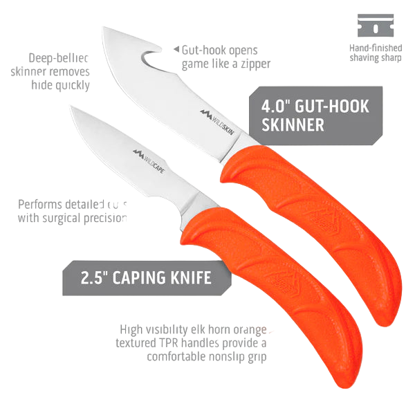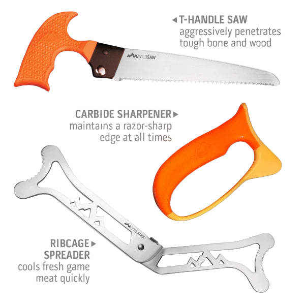 This lightweight, eight-piece, field-to-freezer game-processing set has all the tools to get the job done. It comes complete with a full-tang, 3" caping knife, 4-1/4" gut-hook skinner, 6" boning knife, carbide sharpener, 7-1/4" wood/ bone saw, ribcage spreader, and game-cleaning gloves all in a hardside carry case. Each knife features taper-ground, razor-edge 420 stainless steel blades. Non-slip rubberized blaze orange handles feature a horn pattern inlay for enhanced grip.